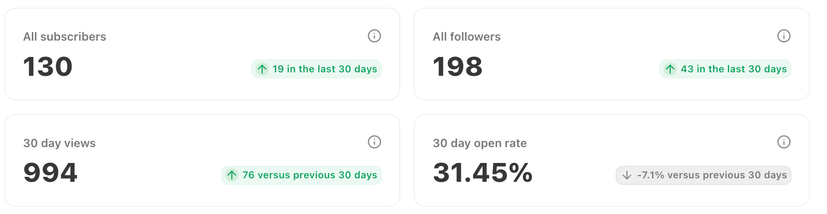 Substack: I saw an increase in subscribers, followers, and views, but a decrease in open rate.