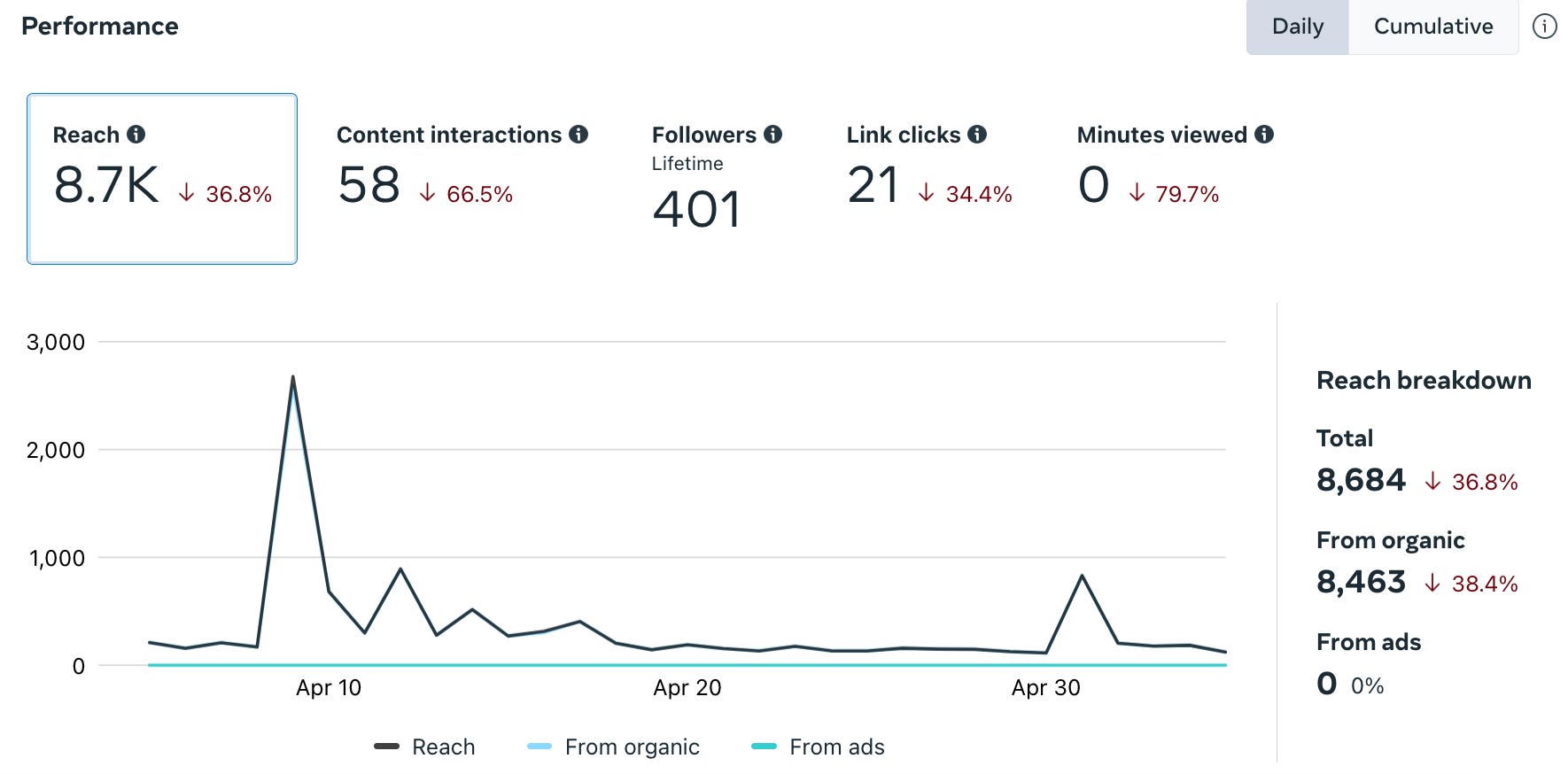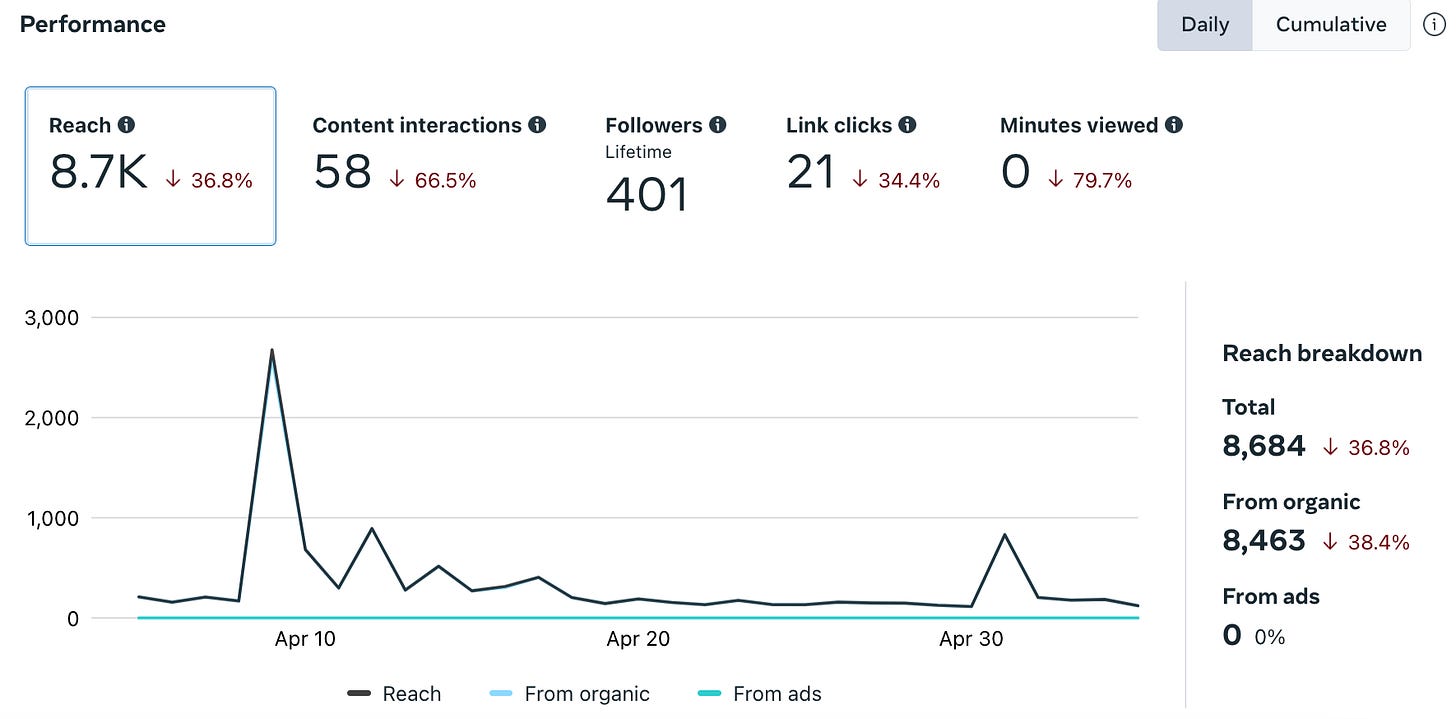 Facebook: Reach, content interactions, and link clicks decreased after a bump around April 10.