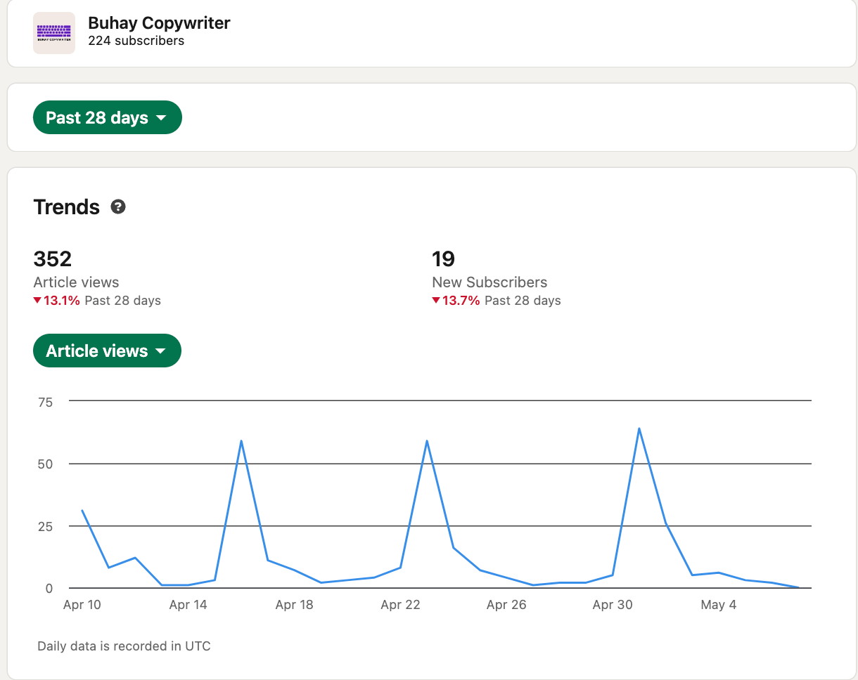 LinkedIn: I saw an increase in subscribers, though it wasnât as fast as the increase of the prior period. Article views decreased as well. The peaks and troughs correspond with my publishing dates for each article.