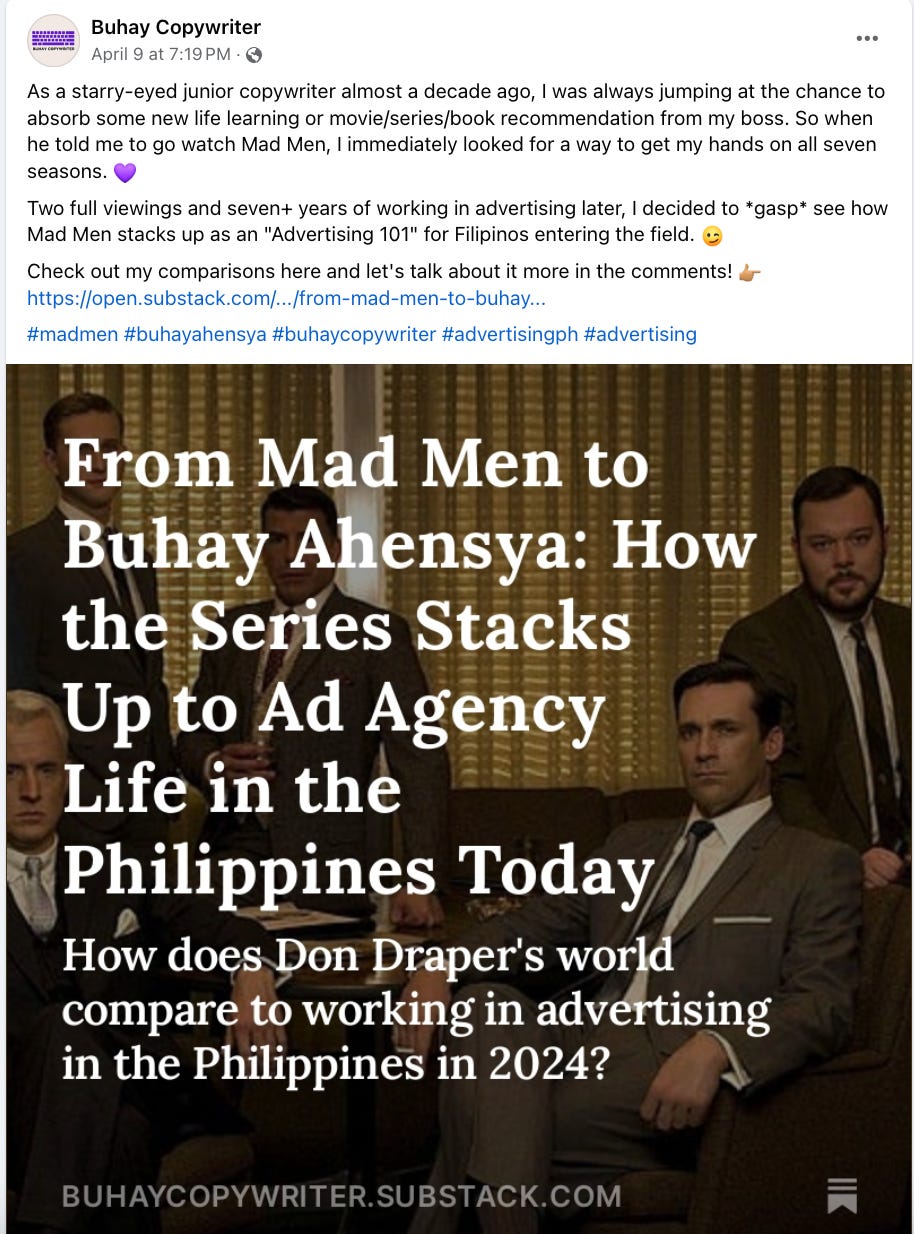 Facebookâs audience likes the Substack-generated square images and the anecdote in the caption (my sharing this to Mad Men-related groups might have helped, too).